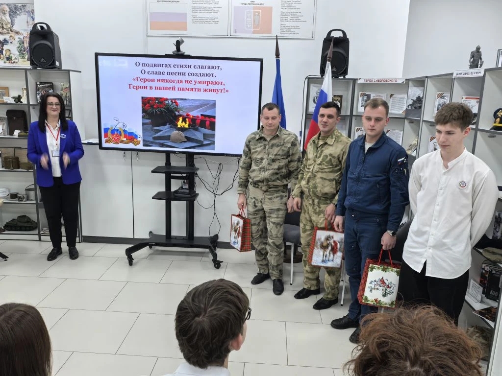 09.12.2025 года в БИЦ семейного чтения имени Л.Н. Толстого для учащихся 11 “Д”, “В” классов (Кл..рук Коноваленко Ю.Г , Игнатова О.В.) прошел час мужества «Люди неба. Ими гордится страна», посвящённый Дню Героев Отечества.