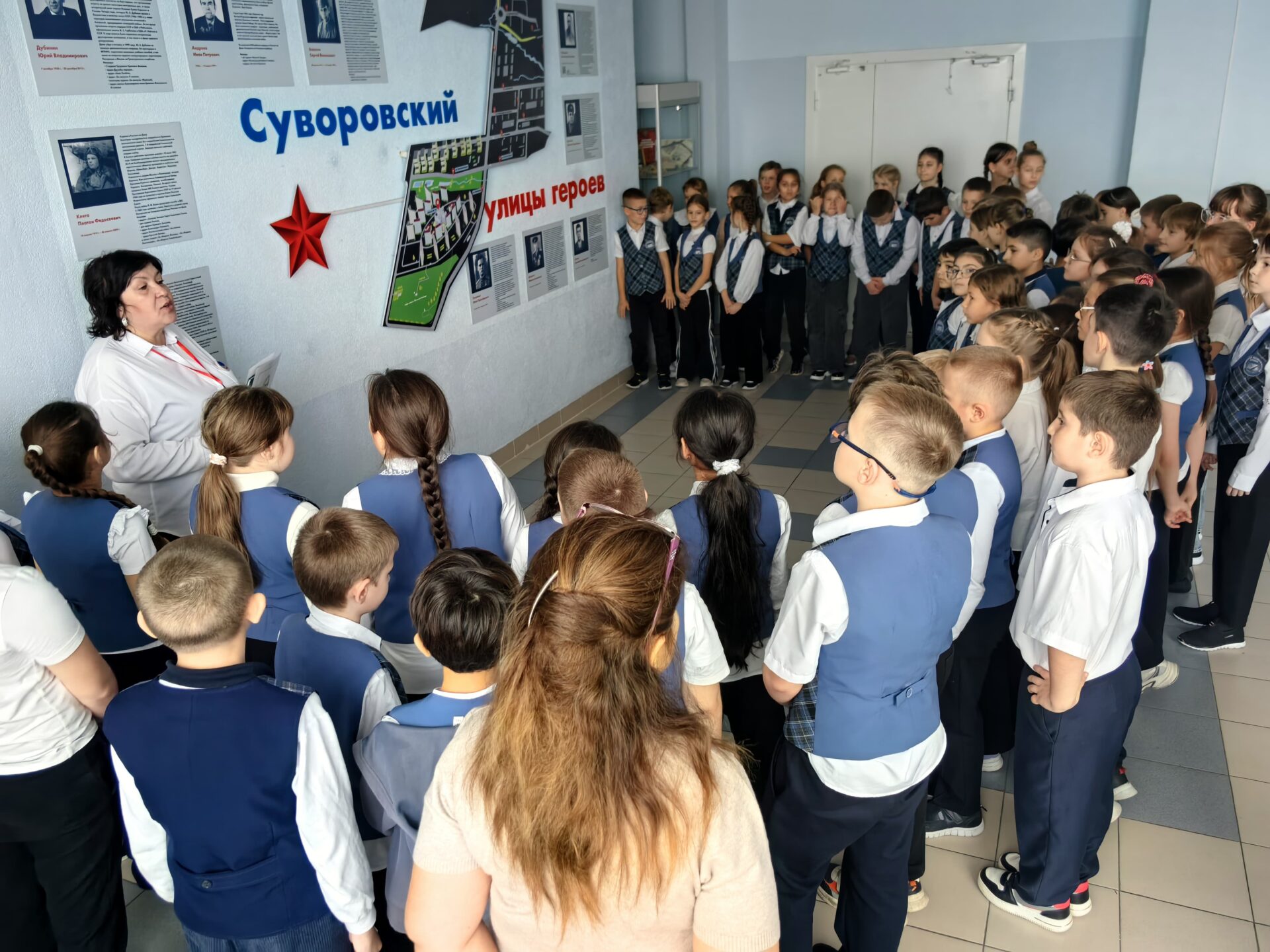 Для учащихся 3 «С» и 3 «К» классов в рамках исторической параллели специалистами БИЦ семейного чтения имени Л. Н.Толстого была проведена экскурсия по улицам микрорайона “В Суворовском жить-суворовцем быть”. Началась она в музее нашей школы. Библиотекари рассказали о том, в честь кого названы улицы, об Иване Никитовиче Кожедубе, имя которого с гордостью носит наша школа. Затем учащиеся совершили небольшое пешее путешествие по ближайшим улицам микрорайона: Уланской, Драгунской и бульвару Измайловскому – и узнали секреты их названий. Завершилась экскурсия на Аллее героев в парке “Чадр”. Здесь установлены сорок стендов, на которых — имена и портреты военнослужащих, погибших в зоне проведения специальной военной операции. Ребята почтили их память минутой молчания.