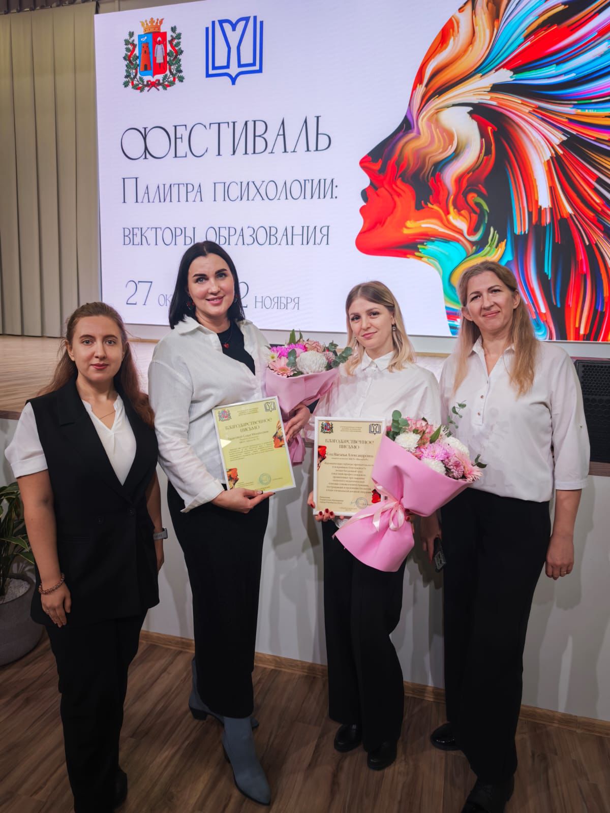 22.11.2025г на закрытии городского Фестиваля «Палитра психологии», проходившего на базе МАОУ «Школа 116», были отмечены благодарственным письмом от Управления образования города Ростова-на-Дону за высокий профессионализм, проявленный при оказании психологической помощи семьям военнослужащих, пострадавших и пропавших без вести в ходе специальной военной операции. Благодарственные письма получили педагоги-психологи МБОУ «Школа 75» Соц Н.А. и Тарасова С.М.