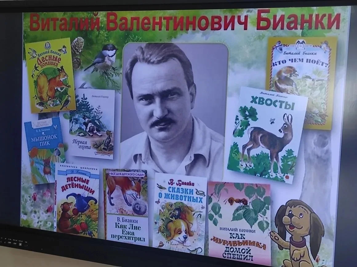Виталий Валентинович Бианки – советский писатель, автор многих произведений для детей. Он очень любил природу, и раскрывал ее загадки самым маленьким читателям на страницах своих книг.Большую часть жизни В.В. Бианки посвятил описанию мира загадочного и неповторимого, таинственного и разнообразного – мира русского леса и его обитателей. Учащихся 2 “И”, 2 “Л”, 3 “К” библиотекарь познакомила с биографией писателя и с такими произведениями как: “Лесные домишки”, “Сказки о животных”, ” Как муравьишка спешил домой”.
