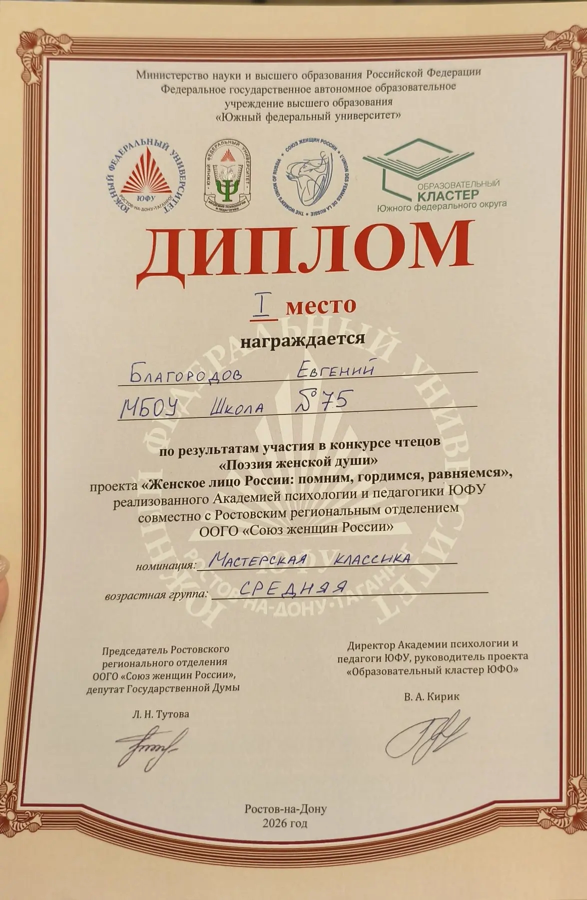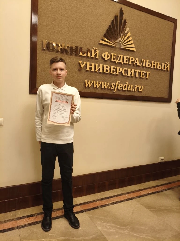 Учащийся 7 “Б” класса по результатам участия в конкурсе чтецов “Поэзия женской души” занял 1 место в проекте “Женское лицо России: помним, гордимся, равняемся”, реализованного Академией психологии и педагогики ЮФУ совместно с Ростовским региональным отделением ООГО “Союза женщин России”.