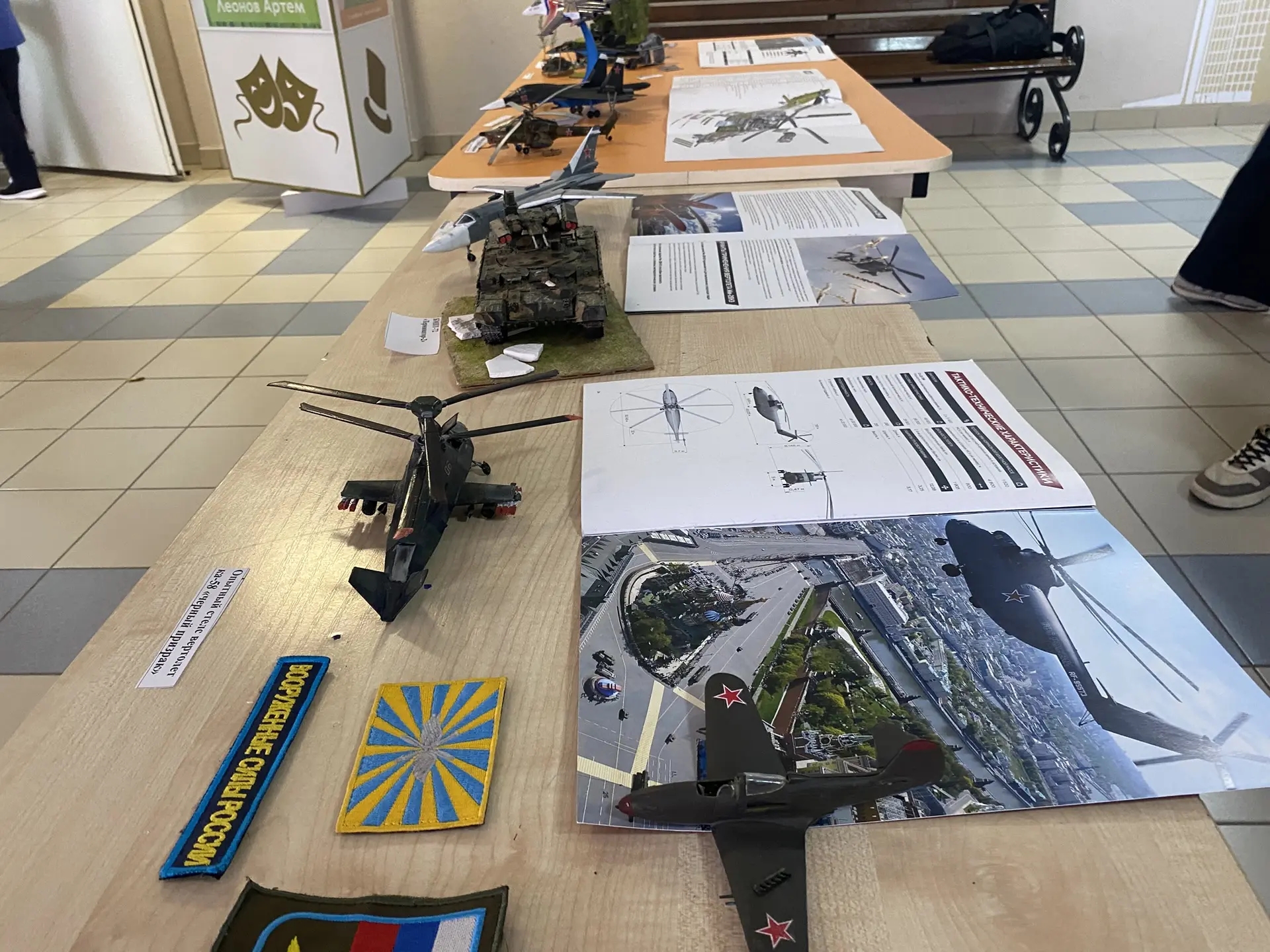 Ученик 8 «В» класса Чеботарев Макар представил выставку моделей военной техники, выполненных собственными руками.